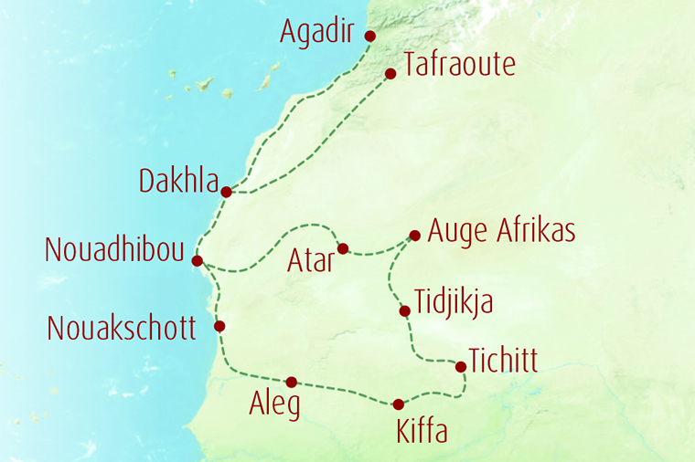 Die Regionen im Zentrum Mauretaniens sind ein Eldorado für Allradfans und bieten uns fantastische Offroad- Etappen. Via Marokko und Westsahara erreichen wir auf guten Straßen Mauretanien, wo unsere Rundreise startet.