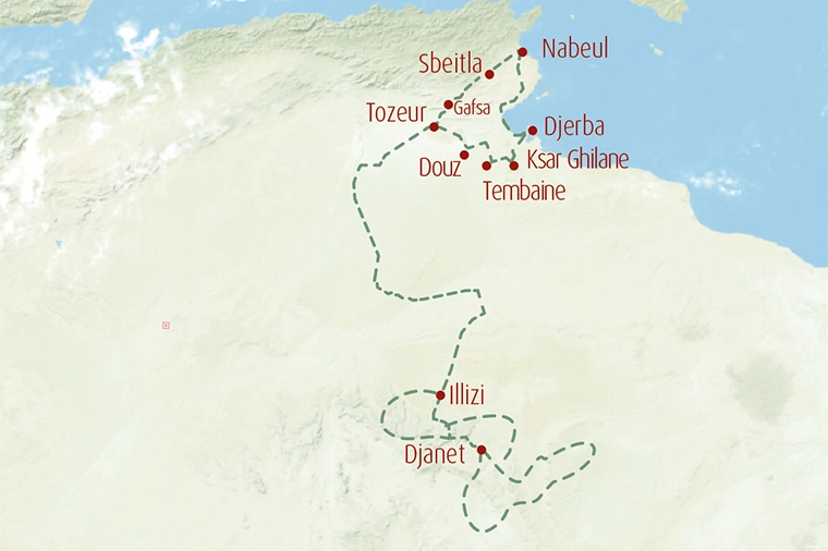 Djanet, Tassili Nationalpark, uralte Felszeichnungen, atemberaubende Felsformationen und hohe Dünenkämme zeigen uns, wie abwechslungsreich Algerien ist. Auch Tunesien bietet uns viele spannende Eindrücke und Fahretappen. Neben den südlichen Dünenfeldern genießen wir hier die Vielfalt des Landes die uns auch kulturelle Highlights und grüne Bergregionen im Norden bietet.